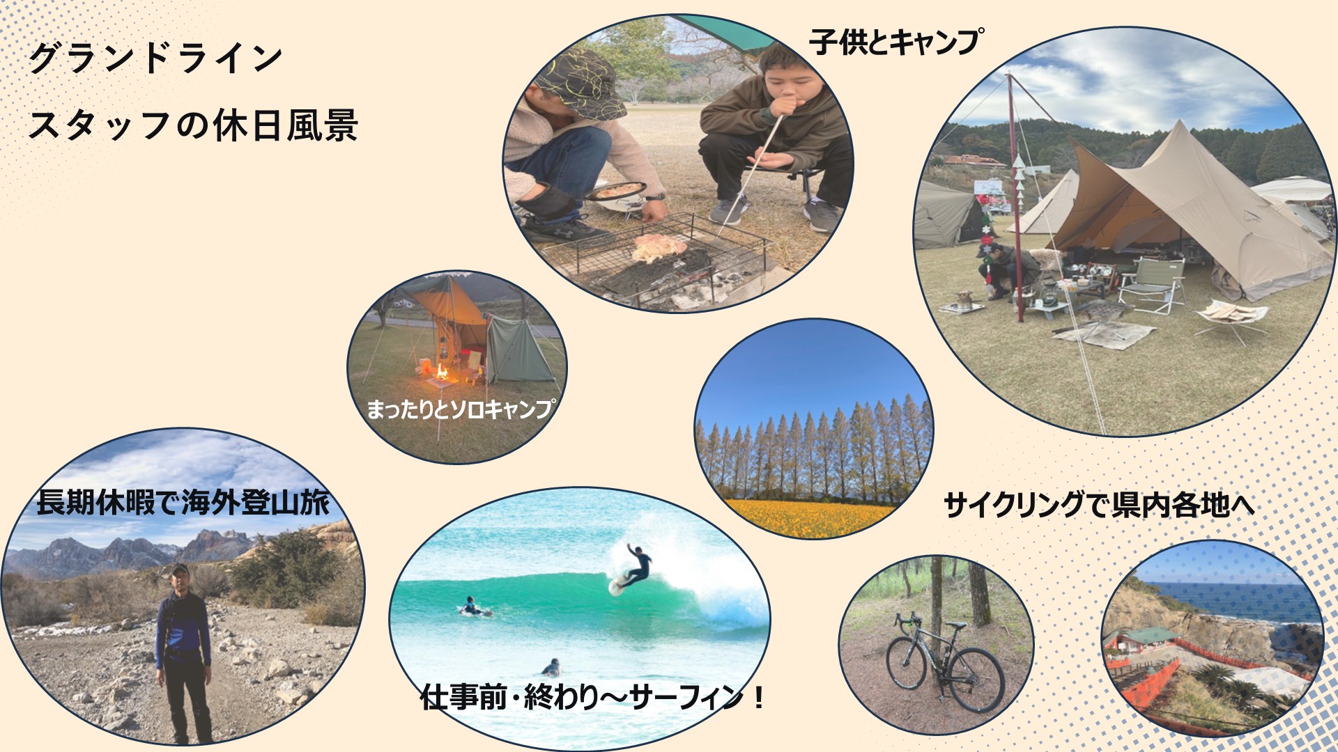 キャンプが好きで、仕事終わりの夕方から「そのままキャンプ場へGO」って事もよくあります! 当社にはアウトドアやスポーツ好きのスタッフも多数もいるので、キャンプや波の情報交換をしています。この仕事は残業が「ほとんどない」ので、すごく良いですね。土日の休みも取れますが、シフトで平日休みも取れるので人が少ない中で趣味を楽しめます。